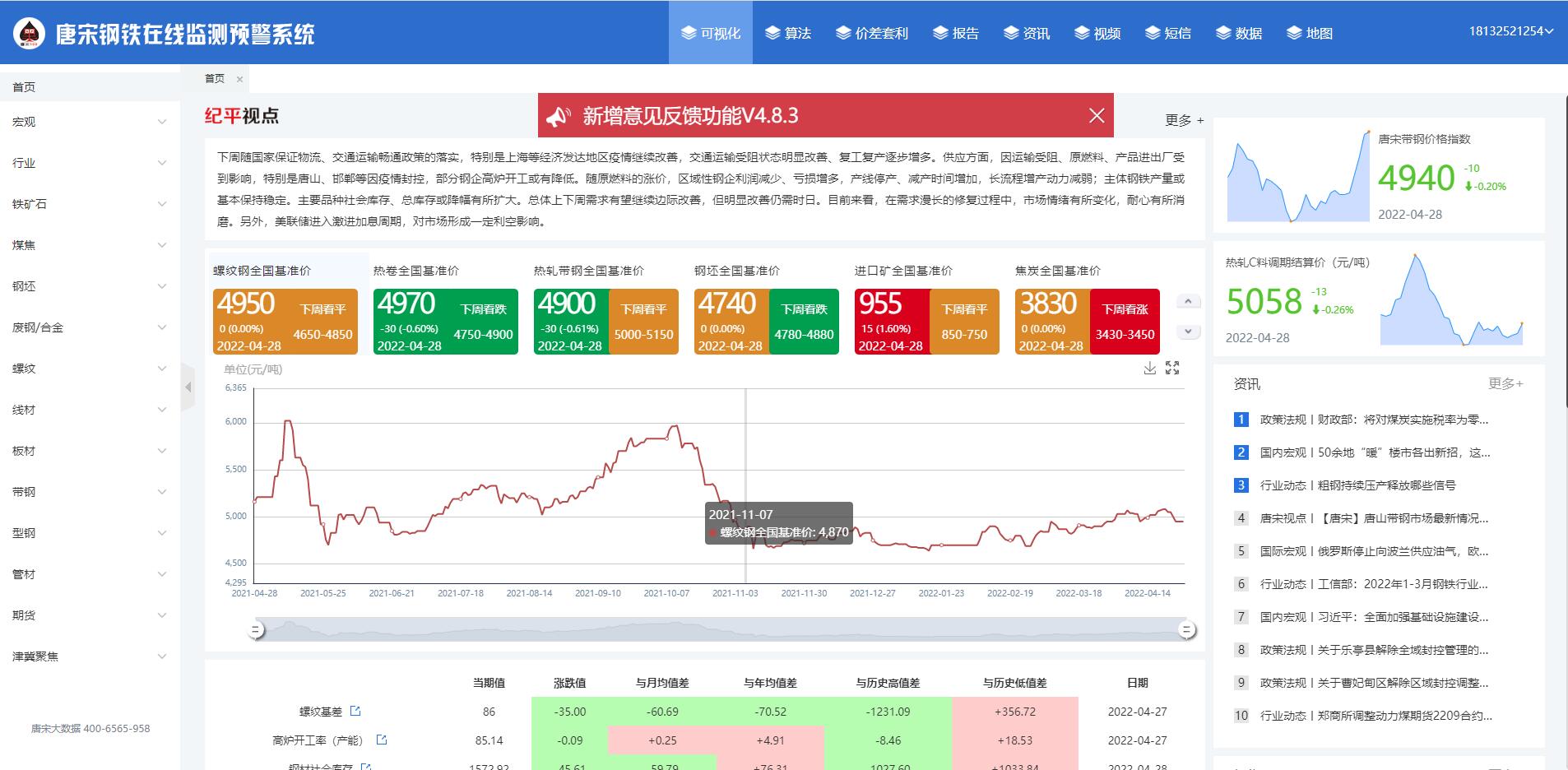 手机终端,核心数据,一键成图,钢坯数据,带钢数据,焦炭数据,铁矿石数据;唐宋信息产品重要的推送手段之一,具有随身、及时、方便等特点。